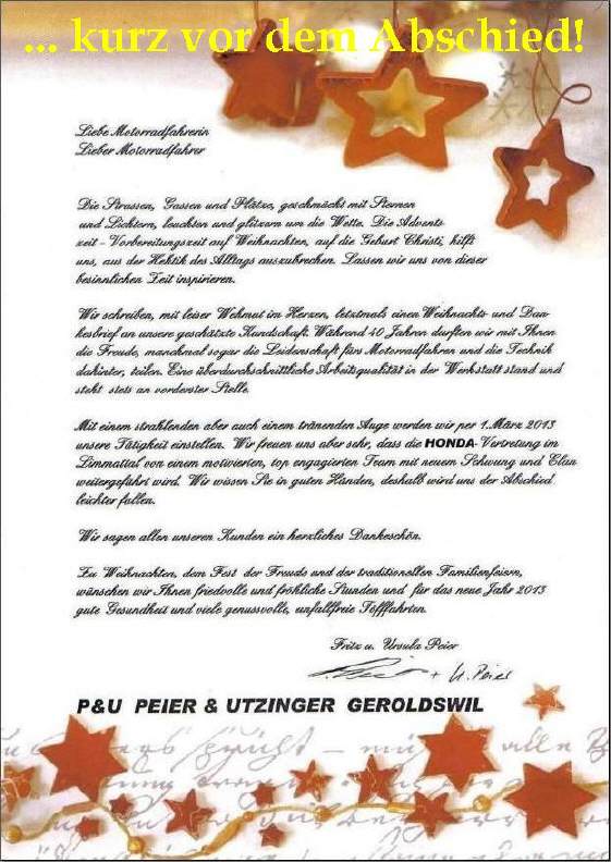19.Dez. 2012: Soeben hat mich der Weihnachtsbrief von P&U erreicht, worin unmissverständlich drinsteht, dass Fritz und Uschi per 1. März 2013 ihr Geschäft ihren Nachfolgern übergeben. Klicke aufs Bild und es erscheint das PDF [614 KB]