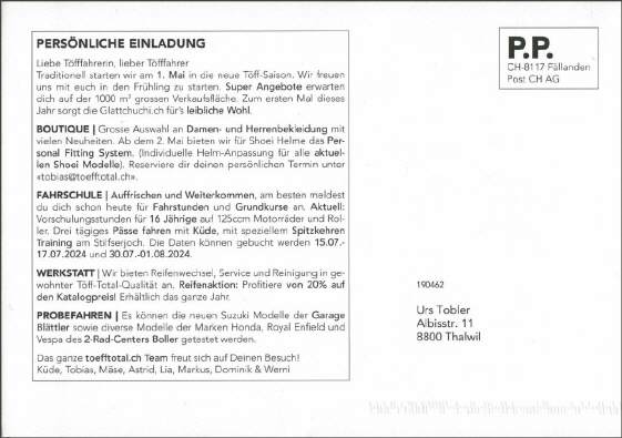 Seit Astrid Hollinger ihren Bekleidungsshop an der Bahnhofstrasse in Wallisellen schliessen musste (leider! da Louis nach Wallisellen gekommen war) arbeitet Astrid regelmässig bei Küde's Töffboutique mit, wo sie ihre riesige Erfahrung einbringen kann! |