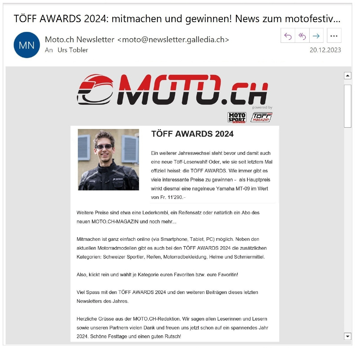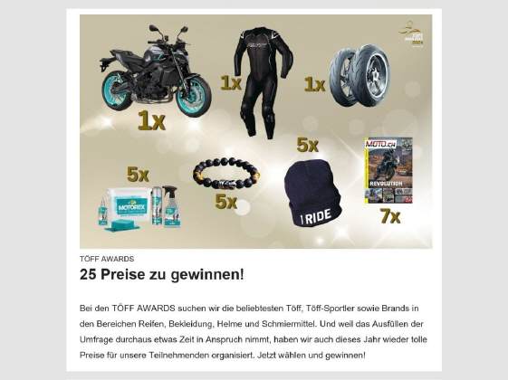 Online kann jede/r mitmachen bei der Wahl des „Töff des Jahres“. Unter den Teilnehmer(inne)n werden tolle Preise verlost, als erster Preis eine Yamaha MT-09 im Wert von11'290 Franken, im zweiten Preis die einteilige Race-Lederkombi RST S1 CE im Wert von 659 Franken, im dri%en Preis ein Set Michelin-Reifen im Wert von etwa 450 Franken. Hier ist der Link zum Wettbewerb! |