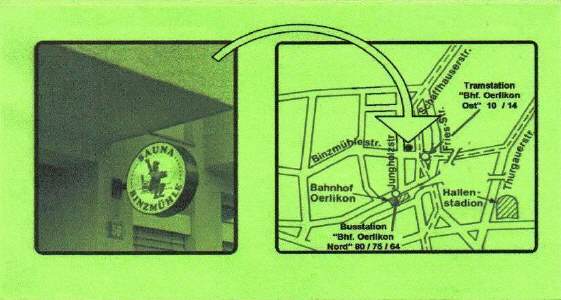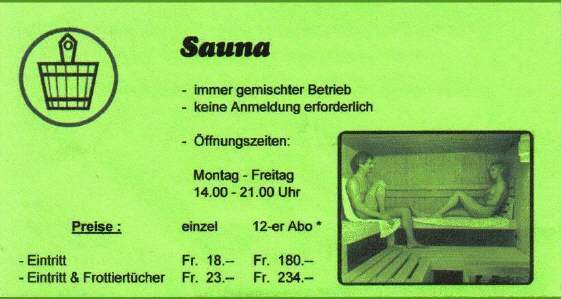 Seit 1988 (mit Unterbruch) gehe ich regelmässig im Winter meistens am Donnerstagabend in die Sauna «Binzmühle», die von Peter Rohrbach geführt wird. Im Sommer natürlich nicht, denn dann gibt's ja die regelmässigen Donnerstagsausfahrten: Dann muss Peter meistens auf mich verzichten, es sei denn, ein 17-19 Uhr Fahrschüler fällt aus und es lässt sich kurzfristig kein Ersatz finden! |