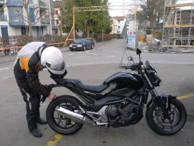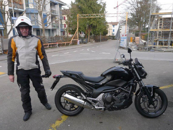 | Arthur kauft schon sein ganzes Leben lang Autos und Motorräder: Unter anderem besass er mal einen Porsche Carrera RS und die legendäre Honda RC30, die er in den Nahen Osten verkauft hat.Sein allerneustes Toy ist eine Honda NC750S mit DCT-Getriebe, das automatisch schaltende Getriebe, wie es inzwischen in über 15 Honda-Modellen angeboten wird. Nach der ersten Maschine, der VFR1200F, die ab 2010 angeboten wurde (die ich zur Nürburgring-Nordschleife fuhr in einer Fahrlehrer-Weiterbildung) folgten nach und nach weitere Maschinen mit dieser Technik, so auch die Palette der NC-Modelle, die aus dem Grossroller Integra (serienmässig), der NC700 (750 ab 2014) im S-Modell (Naked) und X-Modell (Crossover) als Zusatzausrüstung angeboten wurde.