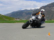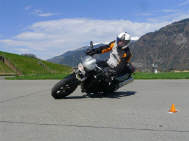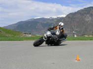 | Das ist Arthur mit der aktuellen kleinen BMW, einer F800R wie Roadster - bei Arthur's Fahrstil wohl eher «R» wie Racing! Als ich die Bilder schoss, musste ich mich aufs Fotografieren konzentrieren. Welche Schräglagen Arthur tatsächlich fuhr, erkannte ich erst auf den Fotos - ui, ui, ui ... Für alle Bilder vom Kurs «klick»e auf obiges Bild!