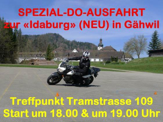 Nun ist die DO-Ausfahrt bereits wieder zu Ende: Zum letzten Mal starten wir diesen Donnerstag um 19 Uhr an der Tramstrasse 109 - der Wetterbericht soll von anfangs regnerischem Wetter frühmorgens zu sonnigem Wetter ohne Niederschläge wechseln. Trotzdem daran denken: Regenkleider helfen warm halten, dies betrifft vor allem die Leder- und Jeans-Gilde! Wir hoffen auf rege Teilnahme! |