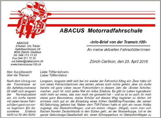 AUSBLICK: Gross gefeiert wird dann im Frühling 2017 aus Anlass des 30jährigen Bestehens der ersten NUR-Motorradfahrschule der Schweiz! |
