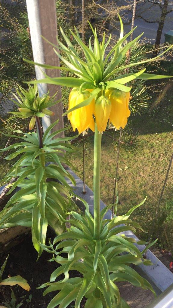 2017-03-29: Der Frühling verwöhnt uns mit herrlichen Temperaturen, und dies nicht ohne Folgen! Im letzten Herbst setzte Sigrid zusammen mit Lise Wallace, die so schön zu ihren Balkonen schaute, Knollen, die im Frühling Blumen spriessen lassen würden. Zu diesem Zeitpunkt wusste ich bereits, dass sie Sigrid selbst nicht mehr erleben würde, da sich ihr Zustand derart drastisch verschlechterte. Vor ein paar Wochen kamen erst Keimlinge hervor, die Blätter wurden immer grösser, Knospen waren zu sehen und gestern, als ich in Dübendorf einen Fahrlehrer-Weiterbildungskurs belegte, entfalteten sich die ersten Blüten! Sigrid hatte eine ganz grosse Freude an Blumen, die sie weiterhin mit uns teilen will ...