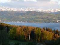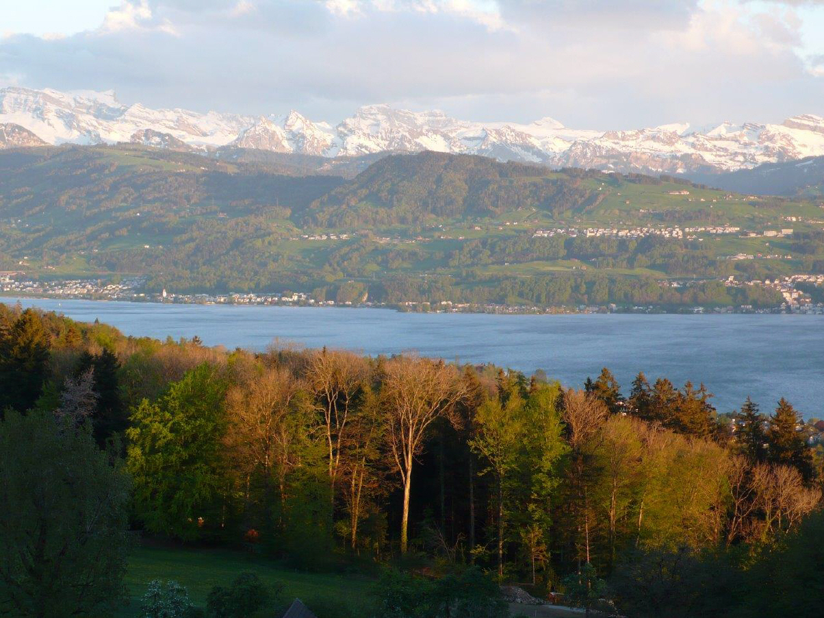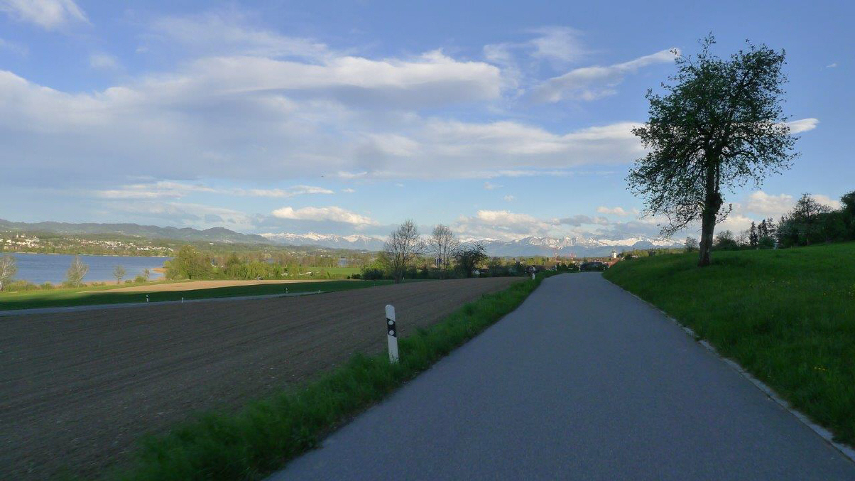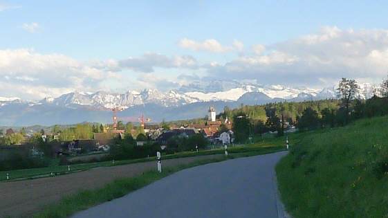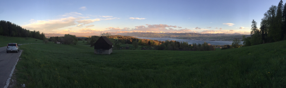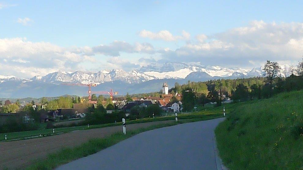 Von Maur ging es wieder hoch nach Aesch und ab da über die Guldenen nach Herrliberg. Nach vielen Auf- und Abstiegen, einem Besuch an der Tramstr. 100 in Uerikon a.See, landeten wir schliesslich in Männedorf, wo es am Widenbad vorbei wieder in Richtung Pfannenstiel ging. Kurz vor Viertel nach Acht trafen wir dort ein, nachdem wir noch einen Fotohalt eingelegt hatten: Der Föhn liess die Berge so wunderbar heranrücken, dass es über die ganze Fahrt eine Augenweide war. |