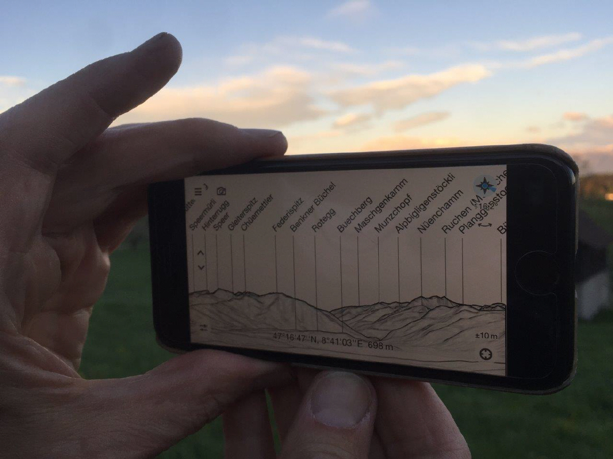 Als wir die Panorama-Fotos machten, zeigte mir Beat, der ursprünglich aus dem Urnerland kommt und natürlich einen viel näheren Zugang zu den Bergen hat, ein App, das automatisch alle erkannten Berggipfel benamste - unglaublich, was es heute alles gibt!