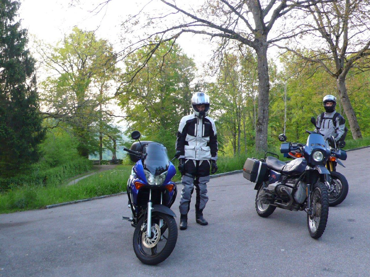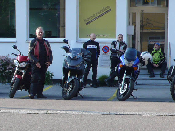 Diesmal durften wir für ein Mal bestimmt mit sicherem Wetter ohne Regen, aber immer noch kühlen Temperaturen starten. Wir wählten eine Strecke, die für alle, auch Gregor mit seiner 125er, gut zu bewältigen war, einer Rundfahrt um den Irchel. Ich starte jeweils über Wallisellen, Kloten und Gerlisberg, um möglichst schnell dem Feierabendverkehr zu entkommen. Das Eigental ist nun wieder befahrbar, aber mit einer 60 km/h-Beschränkung belegt: Gähnen, gähnen ist angesagt - schade für die vielen schönen Kurven. Nach Pfungen erklommen wir die Weinberge und warfen aus der Höhe einen schönen Blick zurück auf Winterthur, mit der Kyburg im Hintergrund. Vorbei am Irchelturm landeten wir über Buch und Berg am Irchel auf der kurvenreichen Strecke, wo wir kurz vor Teufen, unserem Fahrziel, einen Halt einlegten , um hinunter auf den Rhein zu schauen. |