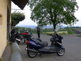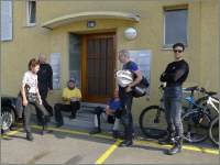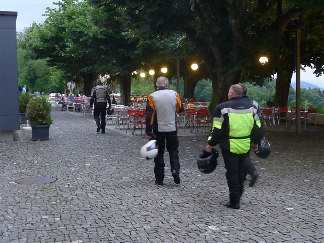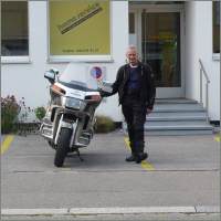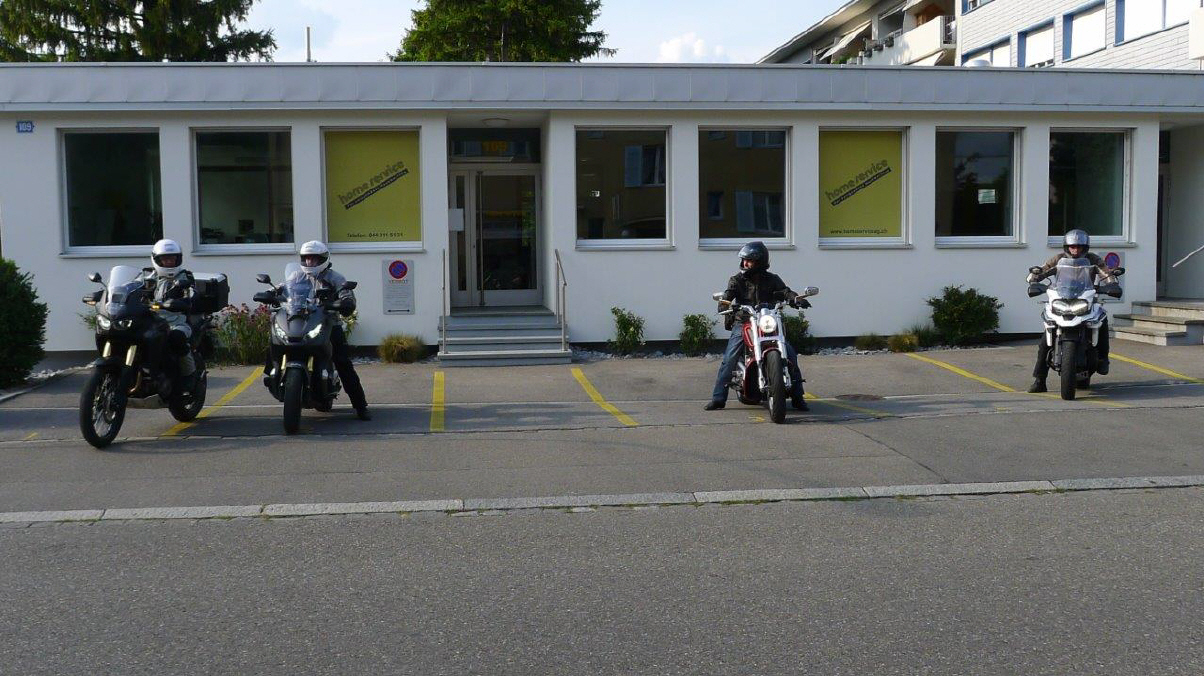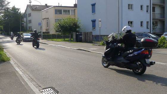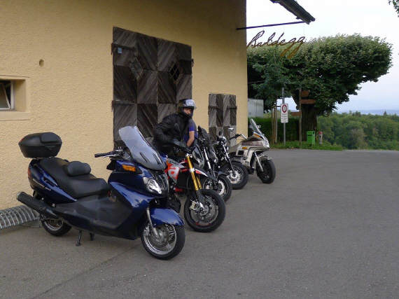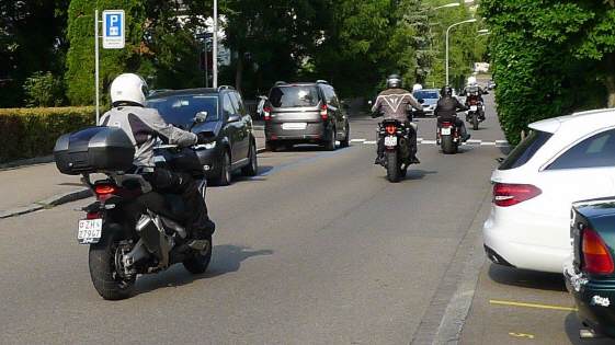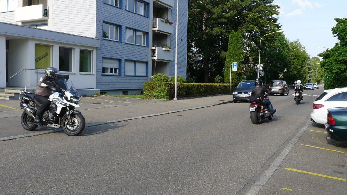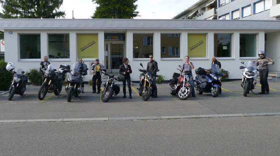 Als ich kurz vor 18 Uhr an der Tramstrasse 109 eintraf, um zu fotografieren, hatten sich alle bereits in den Schatten geflüchtet. Es war wieder einmal sehr heiss ... Schliesslich traf Dominik noch ein, der für einmal eine riesige Triumph Strassenenduro fuhr - sein Cruiser war im Service. Die Maschine passte hervorragend zum «langen» Dominik! Es startete schliesslich Arthur mit 3 TeilnehmerInnen, sowie Roman mit dem Aargauer-Schild übernahm die restlichen 3 Teilnehmer. Ich plante erst um 19 Uhr zu starten. |