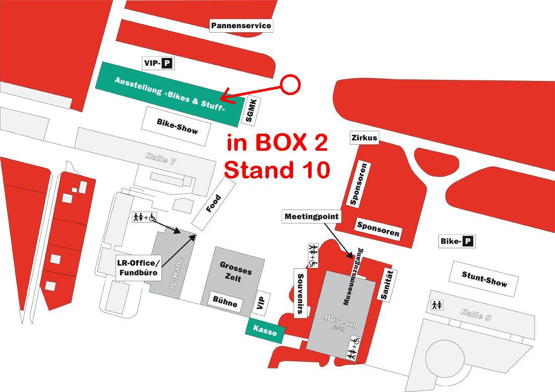 Alle Aussteller haben ihren Stand in einer grossen Halle. Auf dem Platz vor der Halle befindet sich die Bike-Show. Diesmal bin ich ganz am Anfang der Halle in der BOX 2 auf dem Stand Nummer 9. Wer sich einen Gratis-Drink bei mir holen möchte ist herzlich willkommen. Zum Bericht des 16.LOVERIDE 2008 auf das Bild rechts klicken! |