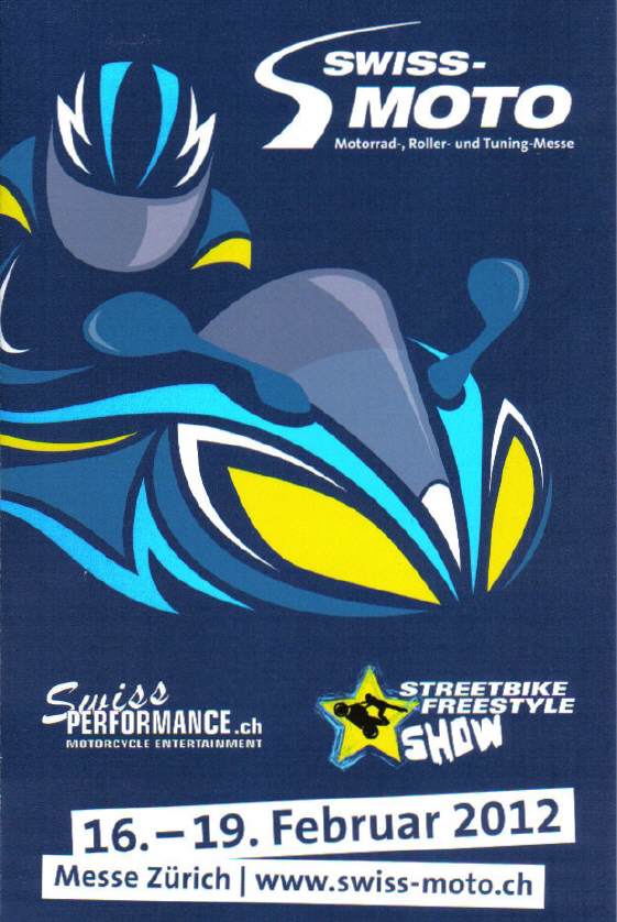 Du findest meinen Stand A12 in der Halle 4 - in der Nähe des Kawasaki-Standes, vis-à-vis des Michelin-Standes. Man kann z.B. bei mir im Milchkasten Eintrittsgutscheine für 8 statt 22 Franken beziehen. Diese kannst Du am Stand bezahlen oder das Geld mit einem Couvert in den Briefkasten werfen! Mehr Informationen dazu auf der speziellen Seite «SWISS-MOTO 2012» (links am Rand anklicken) |