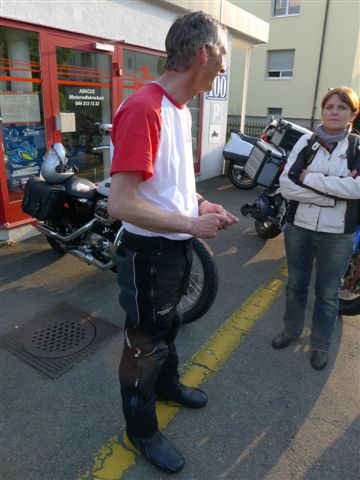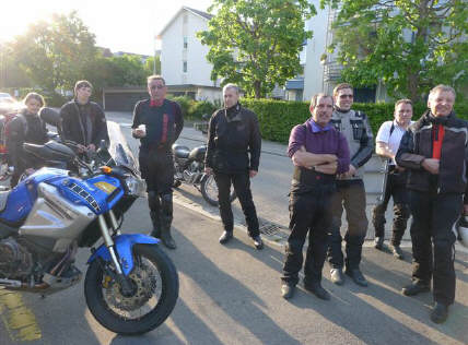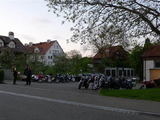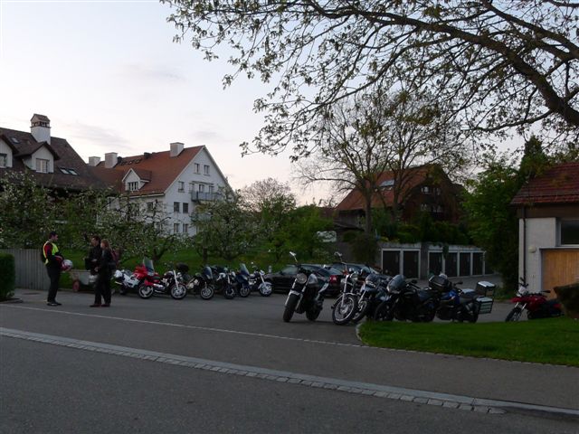 Bei wunderbarem Frühlingswetter wartete eine «ganze Tschuppelete» Töff-Fahrer/innen vor meinem Geschäftslokal, als ich mit meinem Fahrschüler um 10 vor 7 Uhr zurückkam. Es war eine Freude, so viele Leute begrüssen zu dürfen. Wir starteten in drei Leistungsgruppen, nachdem ich, beim ersten Mal etwas ausführlicher, ein «Briefing» gemacht hatte: Gruppenfahrregeln, Verhalten beim Abbiegen, usw. Es gibt nichts ärgerliches, als wenn man Leute verliert. Nicht jedermann ist es gewohnt, in einer grösseren Gruppe auszufahren, speziell die L-Fahrer. Schliesslich starteten wir in drei Gruppen: Dominik startete mit den schnelleren, Arthur übernahm die nicht ganz so schnellen und wurde von Walter Gerig unterstützt - bei mir blieben schliesslich die L-Fahrer, zwei das allererste Mal, hängen. |