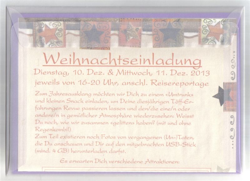 In der Beilage findest Du unsere «Weihnachtseinladung», die dienstags und mittwochs von 16-20 Uhr stattfindet. Im Anschluss daran wird Walter Gerig an beiden Abenden von seiner grossen Reise mit dem 4x4 auf der Seidenstrasse von der Schweiz nach Peking berichten. Ebenfalls: Verkauf von «motomania»-Artikeln.
