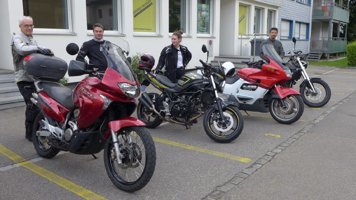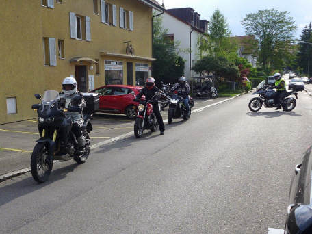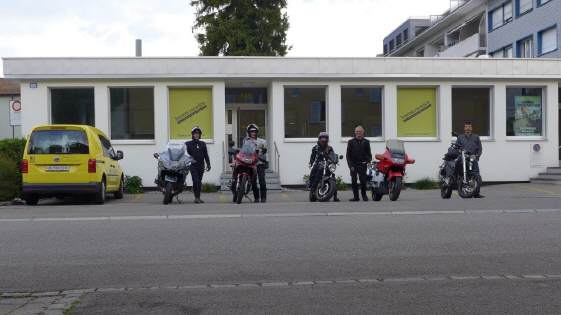 Mit der Gruppeneinteilung waren wir uns schnell einig: Renato übernahm Andrea mit der dicken BMW, der im letzten Jahr die Prüfung bestanden hatte. Die beiden L-Fahrer/innen machten sich mit auf die Tour, Natalja direkt hinter mir und Khash, der bald an die Prüfung geht, als Schlussfahrer. Um nicht immer denselben Weg zu fahren, der wiederum über Illnau führte, wich ich den Regenwolken aus in Richtung Agasul, Weisslingen, um schliesslich doch in Schalchen und Turbenthal zu landen. Ab da ging es über Girenbad, Hofstetten nach Häuslenen, wo uns wegen einer Baustelle der direkte Weg nach Matzingen verwehrt blieb. So mussten wir weiter in Richtung Frauenfeld fahren, um dann schliesslich über Matzingen in Wängi zu landen. |
