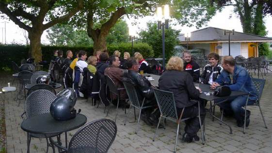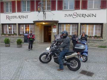 Als wir über die Geleise abbogen, konnte ich in der 30er-Zone gerade noch den letzten Fahrer von Romans Gruppe, Anastasios, erkennen. Arthur hatte sich auf dem Weg ausgeklinkt. Roman's Gruppe hatte bereits parkiert, als wir uns ihnen anschlossen. Ihre Fahrt hat gegen unserer 1 Stunde länger gedauert, mit einer Pause dazwischen. Wir begaben uns ins Restaurant. Alain's Gruppe traf einiges später ein.