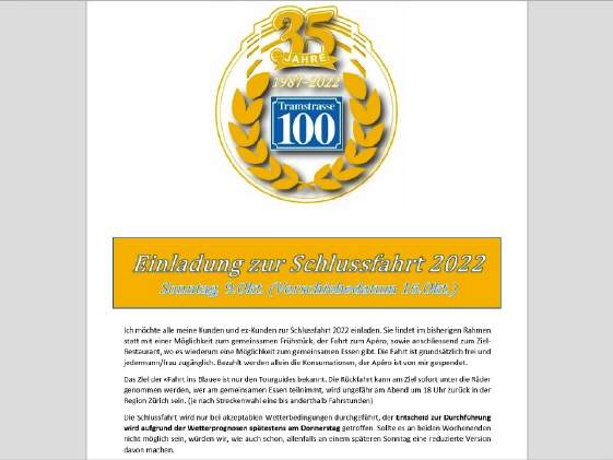 Ende September gehen die DO-Ausfahrten zu Ende, DEFINITIV! Es gibt am Sonntag, 9.Okt. (Verschiebedatum 16.10) eine Schlussfahrt und im Dezember eine letzte Weihnachtseinladung. Per Ende 2022 werde ich nach 35 Jahren «Töff, Töff – nüt als Töff!» meine Fahrschule schliessen. Mehr dazu findest Du im Brief vom 30.August auf meiner Webseite oder als PDF [4'004 KB]