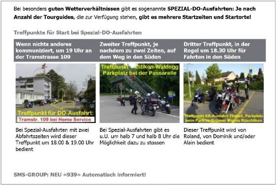Ich erinnere daran, dass es am Besten ist mit einem SMS-Abo: Sende den Text START DOAUSFAHRT an die Nr. 939 und Du erhältst automatisch jeden Donnerstag ein SMS mit Fahrziel und Treffpunkten. Das kostet Dich nur 20 Rappen und Du bist immer bestens informiert und verpasst so keine Lieblings-Destination! Das Abo abbestellen: STOP DOAUSFAHRT an 939, einmalige Abfrage: DOAUSFAHRT an 939 senden (Kosten: -.40) |