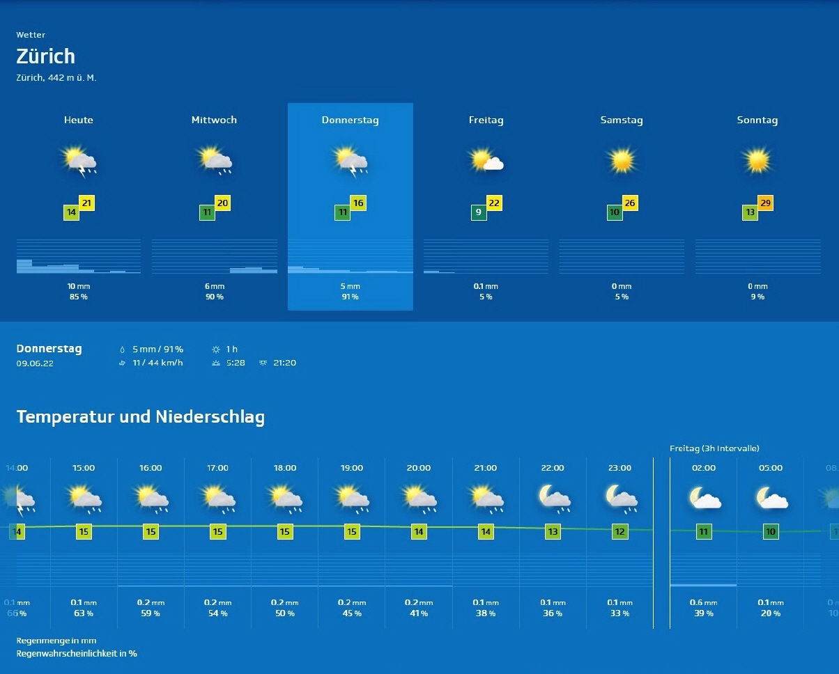 Die Ausgangslage für kommenden Donnerstag ist jedoch grundverschieden: Der Donnerstag ist als Regentag angesagt, abnehmend im Verlaufe der zweiten Tageshälfte. So gesehen wäre es verwunderlich, wenn diesmal mehr als nur der harte Kern erscheinen würde. Deshalb gibt es nur einen Treffpunkt und eine Abfahrszeit, wie gewohnt um 19 Uhr an der Tramstrasse 109. |