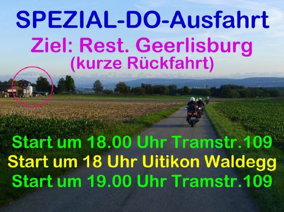 Wenn das Wetter gut ist, sind wir im Rest. «Geerlisburg» willkommen. Das ist nur ein Katzensprung, etwa 10 Minuten von Zürich entfernt. Bei schlechterem Wetter müssten wir ausweichen in den «Sternen» in Nussbaumen bei Bülach. Ab dort ist die Rückfahrt 15-20 Minuten, je nachdem ob man die Hauptstrasse oder die Autobahn nimmt. |