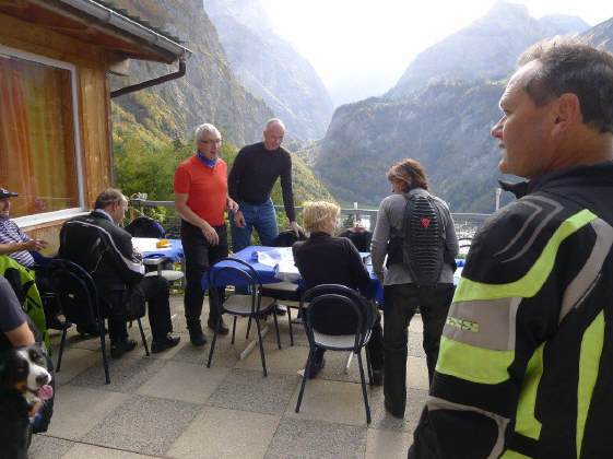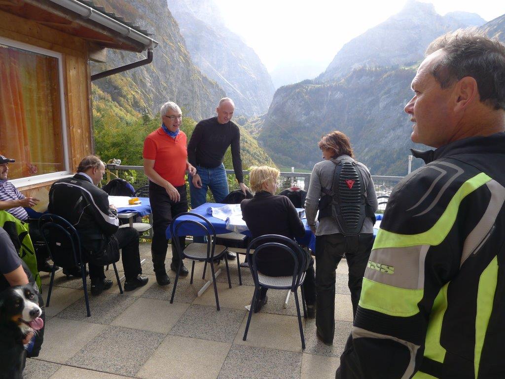 Ein weiterer Höhepunkt war der nächste Halt beim Rest. Bergli am Fusse des Klausenpasses. Dort verbirgt sich ein unbeachtetes Kleinod ein paar Gehminuten weg von der Passstrasse, der «Berglistüber»: Im Gegensatz zum ersten Besuch mit Sigrid, als der ganze Kessel voller Wasserstaub war, der dem Wasserfall den Namen gab, fiel mitte Oktober nur noch eine kleine Menge Wasser die 44 Meter im freien Fall hinunter. Bestimmt wird der eine oder andere zu diesem Ort zurückkehren. Dann teilten sich die Teilnehmenden in die Fahrer und Geniesser: 4 Fahrer fuhren den Klausenpass hoch, während sich die anderen ins Berggasthaus Obbort begaben.