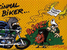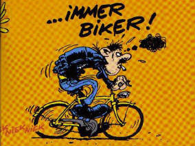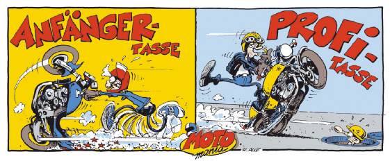 Etwas zu den «motomania»-Comics: Was «Asterix» bei den Franzosen das ist Holger Aue bei den Deutschen - RICHTIG! Wir sprechen nicht von JOE BAR! (moto-comics aus Frankreich) Denn wer motomania liest, kann sich weiterbilden. Holger Aue versteht es, allerlei Töff-Weisheiten, aber auch allerlei Töff-Peinlichkeiten zu Bild und entsprechendem Text zu bringen. Wer «motomania»-Comics liest, weiss über das Töfffahren Bescheid! |