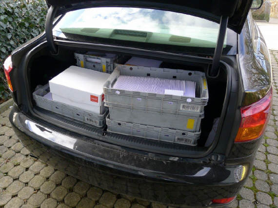 Da ich einige Brief hatte mit Tickets drin, wollte ich sicher gehen, dass die 5-6 Arbeitstage, die sich die Post bei B-langsam Versand mit reduziertem Tarif lässt, nicht ein Problem bei der Zustellung noch vor Beginn der Messe entsteht. So fuhr ich mit den ersten 830 Briefen um 3 Uhr zur Post, um die Briefe aufzugeben. Da es am Nachmittag super lief mit meinen Helfern, ich konnte mir erlauben gar welche auszuladen, fuhr ich kurz nach 18 Uhr nochmals zur Post und brachte die zweite Staffel - mit exakt der gleichen Anzahl Briefumschläge: 830 auf das Stück genau. Zufälle gibts im Leben. Die Sendung übrigens kostete auf den Rappen gleich viel, kein zufälliges Ergebnis offenbar! |