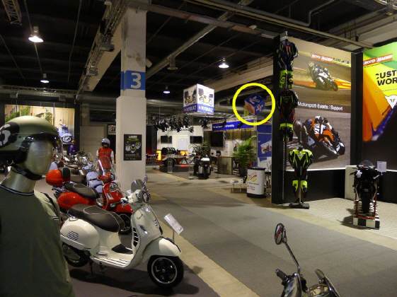 Wenn man die Rolltreppe hochkommt, dann sieht man das Schild des Kyburz-Standes (mein vorvorletztjähriger Standort) und gleich rechts davon in der Höhe den "L-Würfel" meiner Fahrschule. Das rote Zelt ist aus der Ferne nur knapp zu sehen, da es durch die hochaufbauenden Stände wie auch von der CornerBank verdeckt wird!