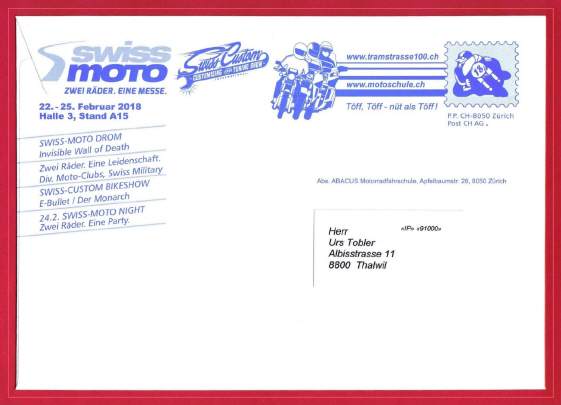 Dank den fleissigen HelferInnen konnten wir die «SWISS-MOTO-Post» am Mittwoch, 14.Febr. auf die Post in Oerlikon bringen: So sollten auch die Briefe mit den Eintrittsgutscheinen rechtzeitig bei den Adressaten eintreffen! Mehr zur Einpack-Aktion findest Du hier