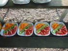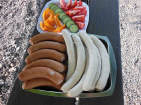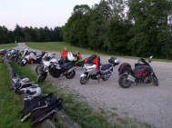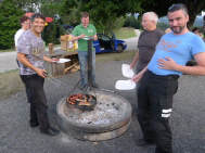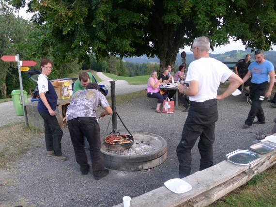 Um 18 Uhr trafen neben den 3 Tourguides Arthur, Alain und Renato, insgesamt 11 Personen ein. Renato übernahm die beiden L-Fahrer mit Begleitung. Alain war ebenfalls mit 3 Personen unterwegs, Arthur übernahm den Rest. Um 19 Uhr waren es inklusive uns drei Tourguides 5 Teilnehmende. Roman kam zusammen mit mir, verfolgt von Milena auf ihrer Vespa. Über Weisslingen versuchten wir mit möglichst wenig Höhenmetern nach Wila zu gelangen, von dort ging es dann in die Schmidrüti, wo die Vespa allein den Berg hoch kletterte. Ich zog zusammen mit Roman los. Dominik übernahm die anderen und schlich sich vom Meiersboden her an. Milly war mit ihren Freund Edi bereits um 17 Uhr am Ort eingetroffen und traf auf eine - Gott sei Dank! - verlassene Grillstelle, sie musste niemanden vertreiben!!! Die Glut, die sie uns um 20 Uhr anboten, war hervorragend, es hätte bestimmt die doppelte Menge Würste gebraten werden können. Ich hatte 24 Kalbsbratwürste und 9 Bauernbratwürste eingekauft, die alle weggingen. Von den 30 Servelats wurden 20 Stück verzehrt. Bei den Getränken waren wir praktisch trockengelegt, ein anderes Mal müssen wir, wenn die Temperaturen wiederum so heiss sein sollten, mehr davon mitnehmen. Wie immer hatte Milly Gurken, Tomaten und Peperoni beigesteuert.
