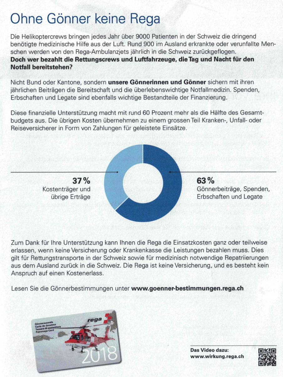 Ohne Gönner keine REGA: Die Kostenträger (Versicherungen usw.) und übrige Erträge durch Dienstleistungen decken nur 37% der Kosten, alle übrigen Kosten (63%) werden durch Gönnerbeiträge, Spenden, Erbschaften und Legate abgedeckt. Ich selbst bin Gönner bei der REGA seit ich mit 19 Jahren bei meinen Eltern ausgezogen bin. Zur Übersicht