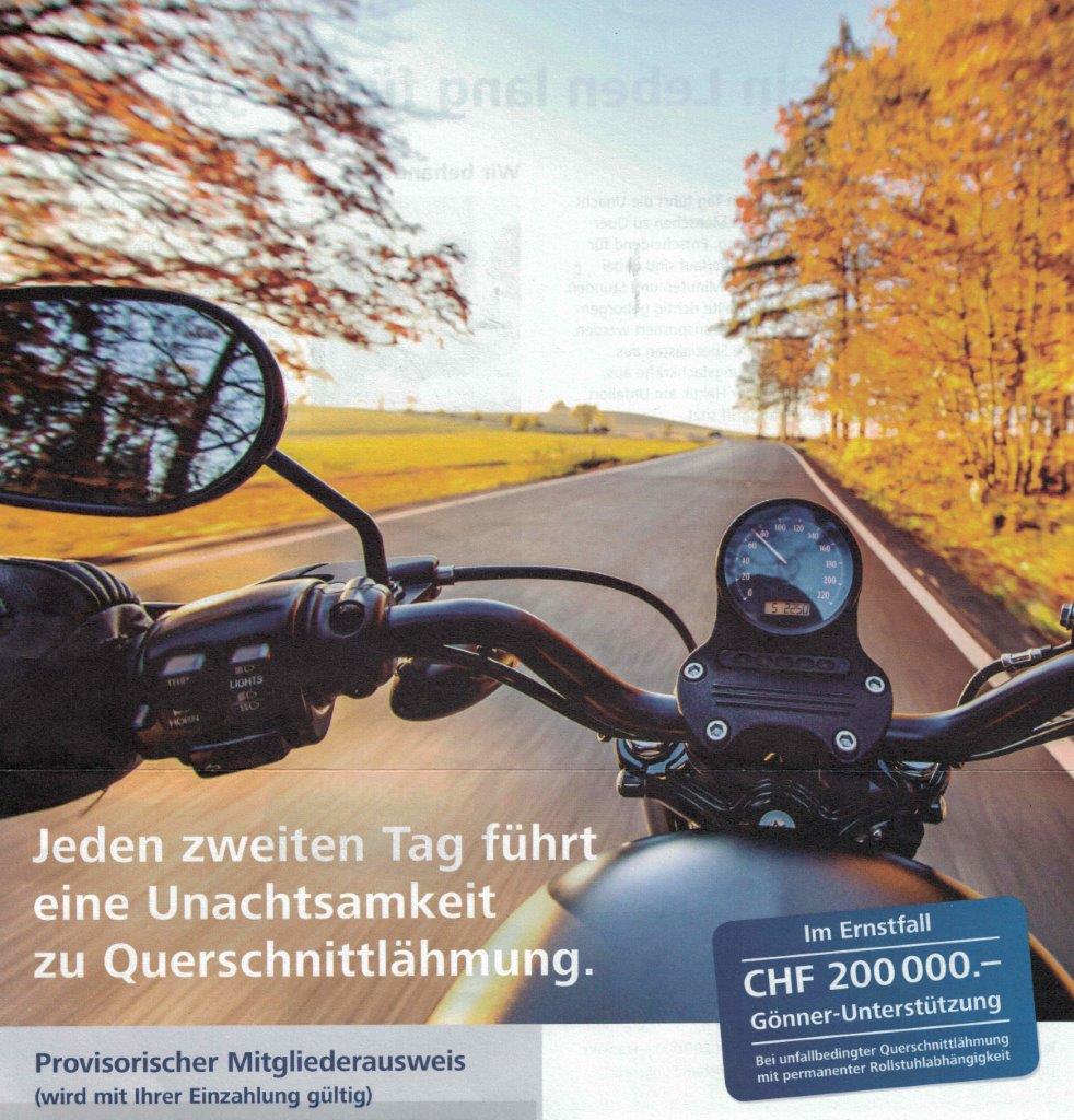 Solidarität ist immer gut, aber noch besser wenn man selbst davon profitiert, bzw. profitieren könnte: Für einen Töff-Fahrer ist die Gönnerschaft in der Paraplegiker-Stiftung Pflicht, schon allein aus Solidarität zu all jenen, die weniger Glück hatten beim Töff-Fahren als wir - «Holz aalange!» Link [1'279 KB]