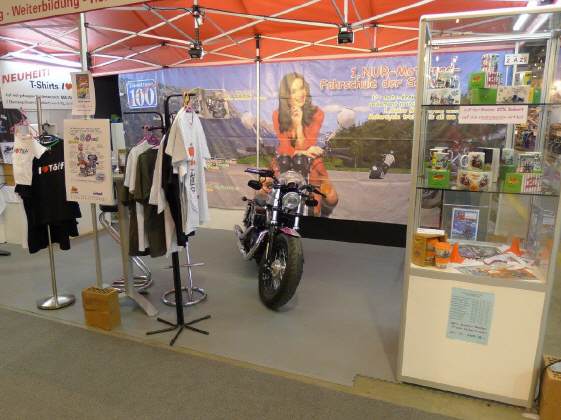 Die grosse Abwesende ist «Anna, meine Stand-Mate»: Sie hat kürzlich eine neue Stelle angetreten und ist in der Probezeit. So muss ich - leider! - auf ihre Mitwirkung in diesem Jahr verzichten. Doch ihre Mutter Elvira, unter grosser Mithilfe von ihrer Freundin Lilian, stand wie immer auf dem Teppich und organisierte alles wie immer. Die «motomania»-Artikel in der Vitrine, dann die diversen T-Shirts und die Preise anschreiben, was halt alles so dazugehört. |