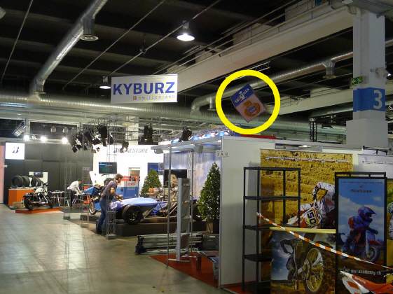Wenn man die Rolltreppe hochkommt, dann sieht man das Schild des Kyburz-Standes (mein vorvorletztjähriger Standort) und gleich rechts davon in der Höhe den "L-Würfel" meiner Fahrschule. Das rote Zelt ist aus der Ferne nur knapp zu sehen, da es durch die hochaufbauenden Stände wie auch von der CornerBank verdeckt wird!