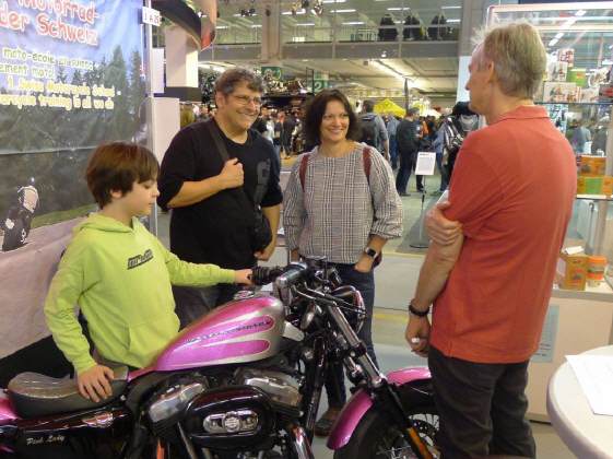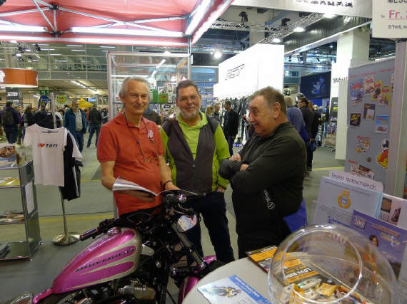Pünktlich um 10 Uhr strömten die Messebesucher in die Halle: Am Donnerstag kommen die Gäste aus der ganzen Schweiz. Mein «eye-catcher», die GL 1000 LTD. von Markus Egli schlug voll ein! Ich glaube, es standen noch so viele Leute in unserem Stand. Es waren viele GoldWing-Fahrer dabei, teilweise vom Club, neueingetretene und ausgetretene, aber auch viele aus der Zeit der Club-Gründung 1978. Weiter kamen viele Töff-Fahrlehrer, aktuelle und ehemalige Fahrschüler. Auch durfte ich einige Beratungsgespräche durchführen, auch mit pontentiellen Kund(inn)en aus der Region. |