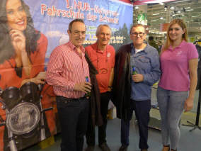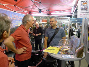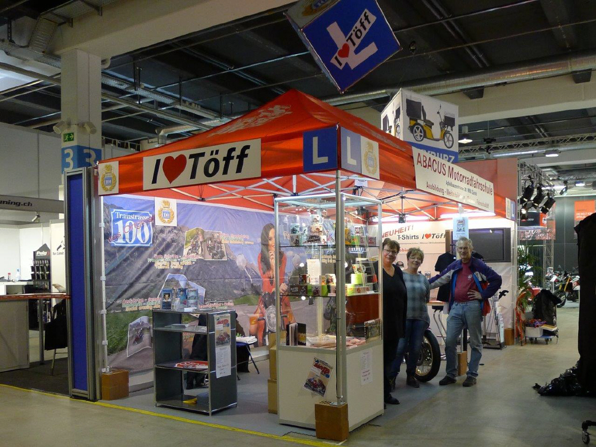 Die grosse Abwesende ist «Anna, meine Stand-Mate»: Sie hat kürzlich eine neue Stelle angetreten und ist in der Probezeit. So muss ich - leider! - auf ihre Mitwirkung in diesem Jahr verzichten. Doch ihre Mutter Elvira, unter grosser Mithilfe von ihrer Freundin Lilian, stand wie immer auf dem Teppich und organisierte alles wie immer. Die «motomania»-Artikel in der Vitrine, dann die diversen T-Shirts und die Preise anschreiben, was halt alles so dazugehört. |
