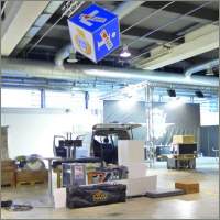 Da es vor allem im letzten Mal zu erheblichen Verzögerungen beim Aufbau des Standes kam, weil der Würfel zu wenig hoch aufgehängt worden war, habe ich mich früher darum gekümmert. Ich holte ihn bei Holdener Reklame in Zürich-Altstätten ab und lieferte ihn bereits am Freitagnachmittag um halb 2 Uhr in der Halle 3 ab. So konnte sich das Winkler Team Zeit lassen - und siehe da, am Samstag hing er bereits in der Höhe! Merci, Sämi für den guten Service. |