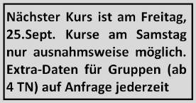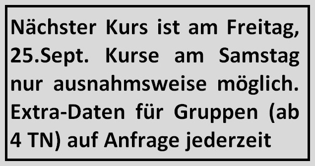 Der nächste Kurs findet dann wieder zum letzten Freitag im Juni, am FR, 26. Juni 2020 statt! |