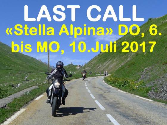 Die «Stella Alpina»-Tour, verkürzt auf 4 Tage, kamzustande. Wir starteten in der Waldegg zu zehnt am Freitag, 10.Juli zu einer sehr tollen Fahrt - die «Stella» selbst feierte das 50.Jubiläum! Meine GoldWing nahm sie zum 2.Mal (nach 1987) in Angriff, wir erreichten beinahe den Sommeiller, auf der Rückfahrt beinahe das Limit. Mehr dazu (inArbeit): «Klick»-e aufs Bild!