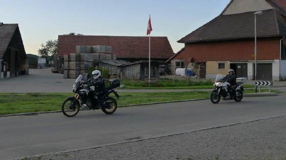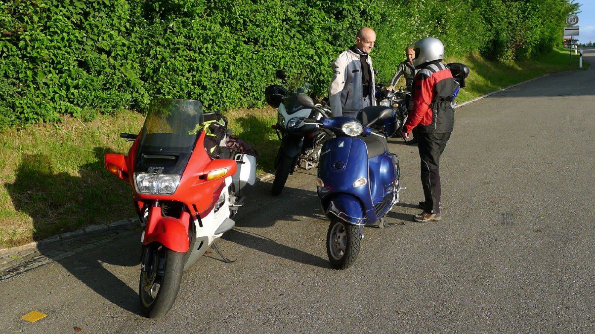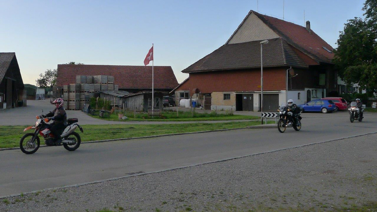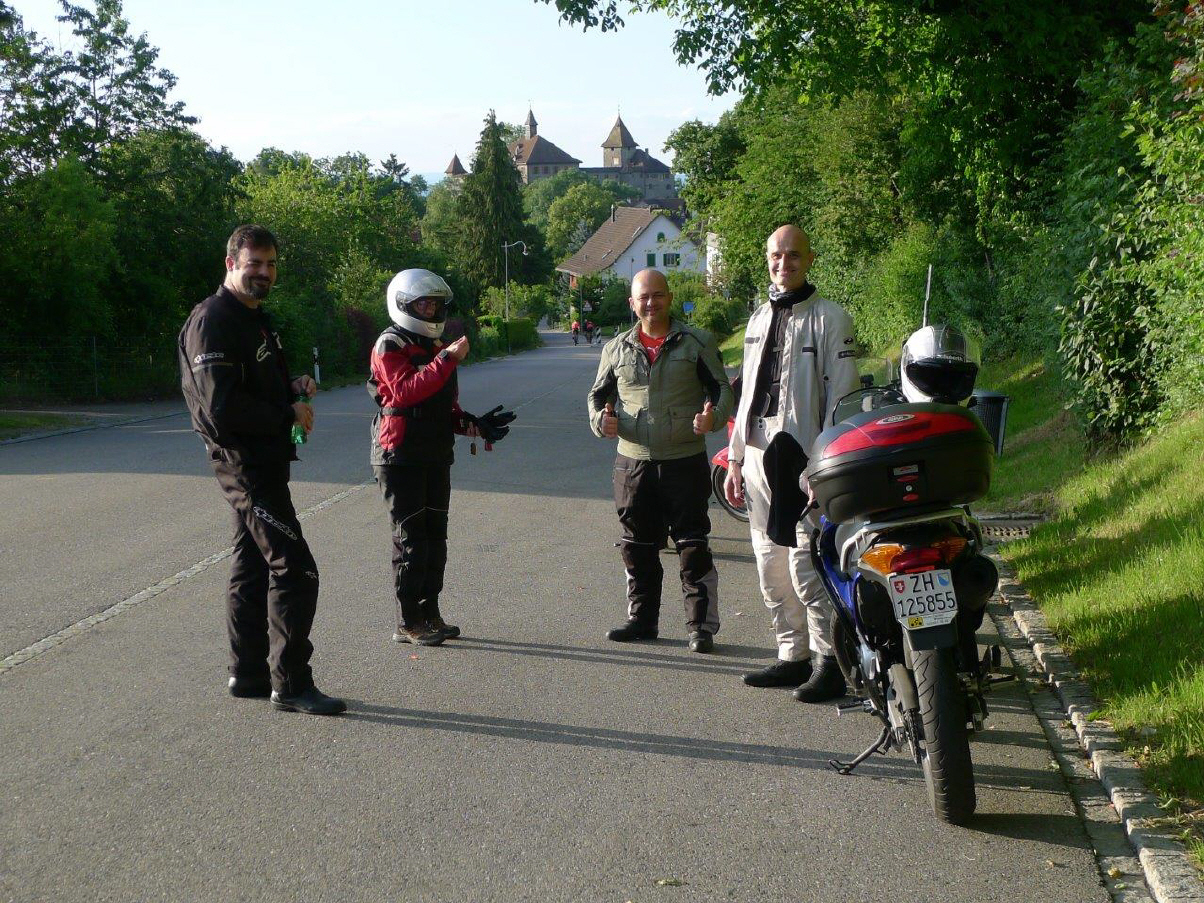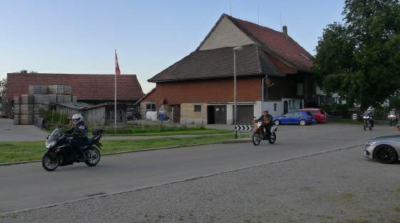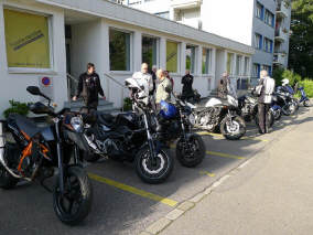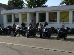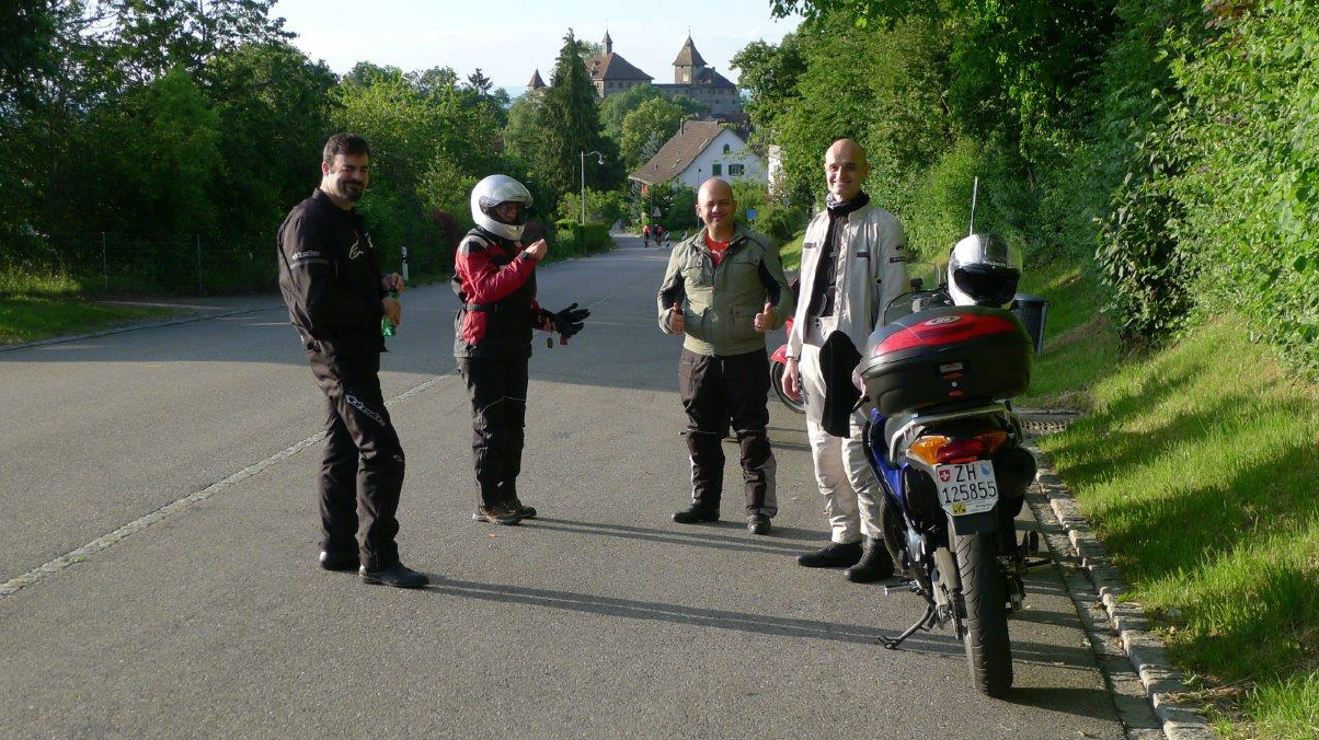In meiner Gruppe nahm ich neben unserer treuen Vespa-Fahrerin Milena die L-Fahrer Yannis, Pereira und Gregor mit. Wegen der Vespa versuchte ich die Strecke flach zu halten. Über Illnau erreichten wir die Kyburg, dann ging es über Winterthur-Breite nach Töss, Pfungen über Lufingen zurück nach Kloten-Gerlisberg, wo wir als erste Gruppe eintrafen. So konnte ich schliesslich die anderen Gruppen bei ihrer Anfahrt fotografieren. |