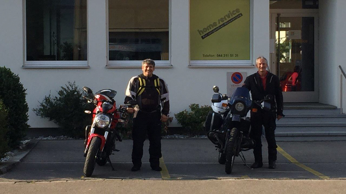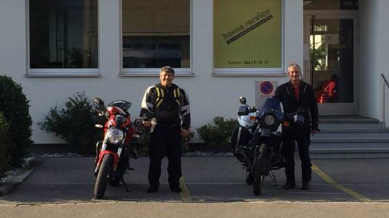 Ohne Bild - die beiden Tourguides Arthur und Alain empfingen - noch nicht im im Regen! - 2 Teilnehmende, Urs auf der grossen Honda Crosstourer und Myriam auf der Triumph Tiger, die sich diese Fahrt nicht entgehen lassen wollte.