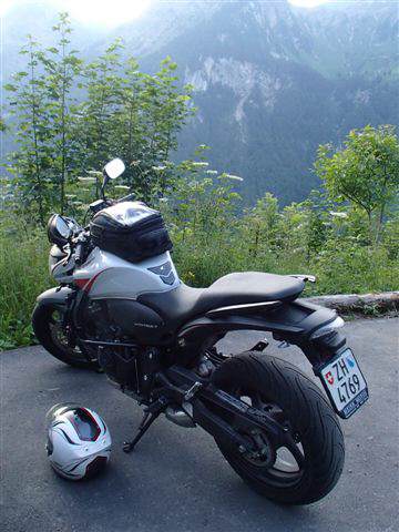 Auf dem Parkplatz auf der Waldegg, den wir in kürzester Zeit (Ferienzeit in Zürich lässt grüssen!) erreichten, wartete Daniel auf der neuen Africa Twin. Seine Entscheidung, mit uns über den Pragel zu starten, war in Anbetracht des Wetters keine gute Idee. Über den Türlersee landeten wir in Sihlbrugg, wo es in Richtung Menzikon weiterging. Wir erreichten diesmal über den Zugerberg (erst Edlibach rechts den Berg runter, dann wieder in Richtung Ägeri den Berg rauf) den Ägerisee, wo bereits dunkle Wolken am Horizont nichts Gutes verhiessen. In Sattel schaute ich erstmals aufs Handy, um zu schauen, ob die Gruppe vor uns eine andere Entscheidung getroffen hatte. Myriam meldete 4 Personen, auf der Höhe Ibergeregg-Pass um 20.18. Ausgangs Schwyz begann es heftig zu regnen und wir retten uns unters Dach einer Tankstelle in Richtung Muotathal. Hier empfing ich kein weiteres SMS, also war die Gruppe vor uns in Richtung Pragel unterwegs. Daniel drehte aufgrund der Wettersituation um - welch gute Entscheidung, ihm blieb viel erspart -, während Claudio und ich uns in einen heftigen Gewitterregen begaben. Es wurde immer schlimmer und auf dem Weg zum Pragel blitzte und donnerte es gar. Dafür hatten wir mit der Passhöhe den Regen hinter uns gelassen und wir fuhren auf nasser Fahrbahn dem Klöntalersee entgegen. In den Waldpartien war es schon recht dunkel, mit dem letzten Tageslicht erreichten wir Riedern und schon bald fuhren wir dem Bergli entgegen. Die Strasse war teils abgetrocknet, immer im Übergang vom Nassen ins Trockene sahen wir 4 Töffspuren. Es dürfte also noch nicht viel Zeit vergangen sein, dass die 4er-Truppe mit Arthur und Alain vor uns eingetroffen war.