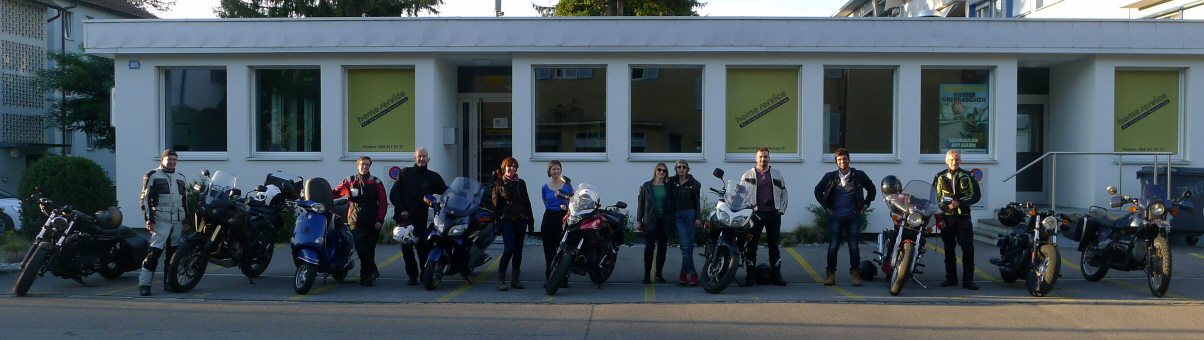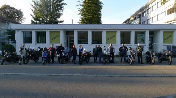 Diesmal waren Roman und ich als Tourguides zuständig für diese DO-Ausfahrt, welche neben 19 Uhr auch um 18 Uhr startete. Ich staunte nicht schlecht, als ich um 7 Uhr eintraf: Ganze 8 Motorräder erwarteten mich. Roman packte die drei (!) anwesenden Frauen ein, während ich mich der übrigen annahm: Mit Ursula und ihrer Sozia hatte ich auch eine Frau in der Gruppe, Beat machte den Schluss. Die beiden L-Fahrer reihten sich hinter mir ein. Mit 10 Minuten Verspätung trafen bereits im Dunkeln in Rüti bei Winkel ein. |