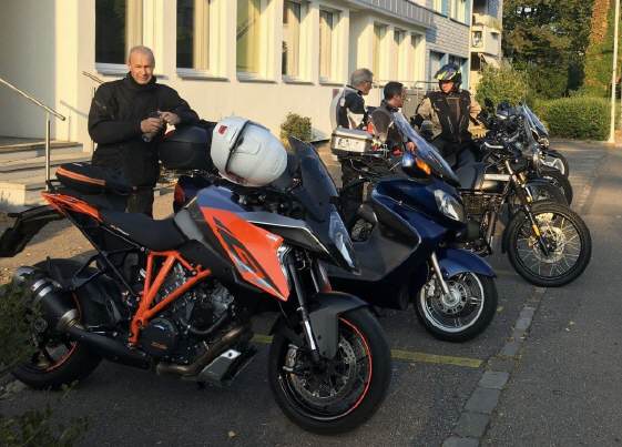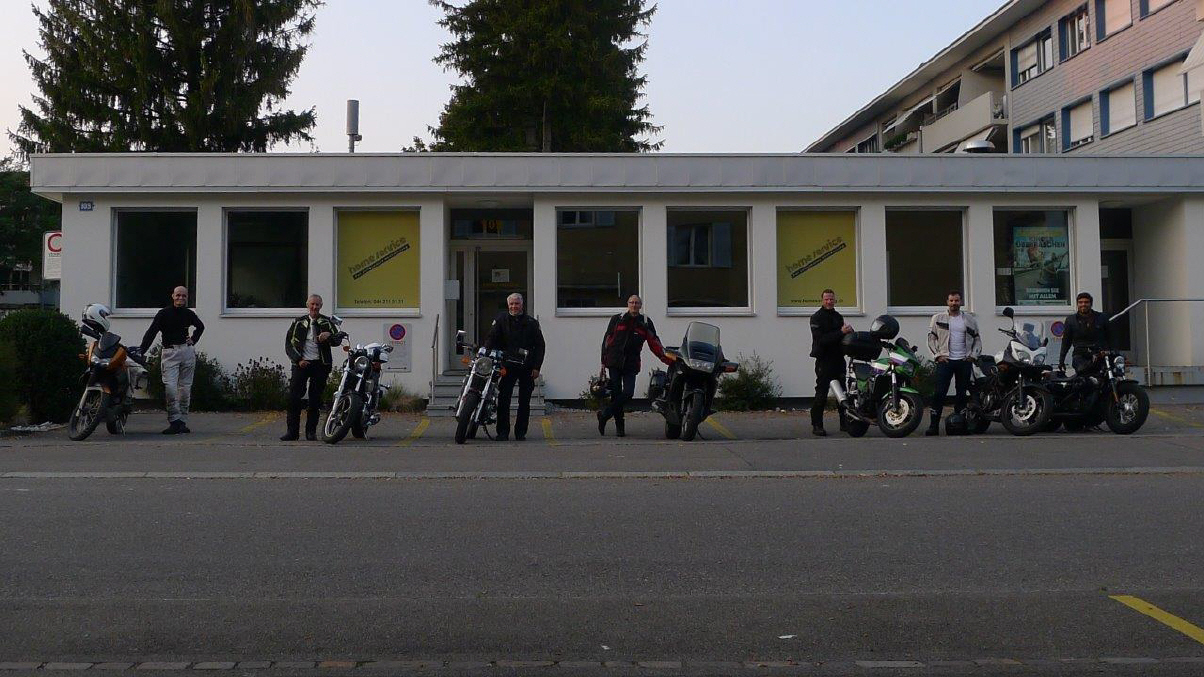 Überraschung: Was für ein grosser Auflauf zu so später Stunde ... - in Anbetracht der Jahreszeit! Ja, tatsächlich hatten wir nochmals sommerliche Verhältnisse und so war es nicht verwunderlich, dass es so viele zur 2.letzten Ausfahrt geschafft haben. Da ich der einzige Tourguide war, mussten wir ausnahmsweise zu siebt starten. |