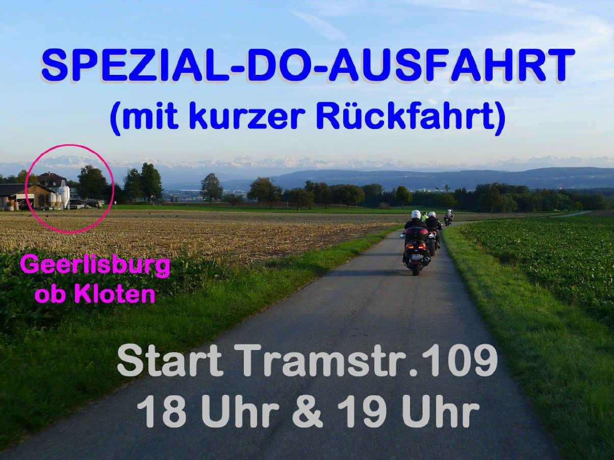 Und noch einmal: Auch an diesem Donnerstag ist nochmals tolles Ausflugswetter angesagt, deshalb führen wir eine weitere Spezial-DO-Ausfahrt, bereits die zwölfte (!) durch, mit Start um 18 und um 19 Uhr an der Tramstrasse 109! Da die meisten Tourguides in den Ferien oder leider abwesend sind, bleiben nur Arthur, der um 18 Uhr startet, und ich, mit dem Start um 19 Uhr übrig. |