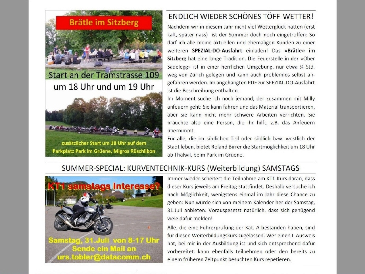 Unter Veranstaltungen gibt's AKTUELL DAS RENNSTRECKENTRAINING IN MOST/CZ: Kurzfristig noch Möglichkeit, mit einzusteigen! Wer allenfalls nur zum Zuschauen und Mitfiebern mitkommen möchte, ist herzlich eingeladen! Denn alleine die Strecke zu fahren ist unangenehm. (mit Motorrad und Teilnahme am Rennstreckentraining: Beteiligung an Benzinkosten, ohne Töff nur Hotelkosten ca. Fr. 200.-) Im Bus habe ich Platz für 1-2 Mitfahrende.