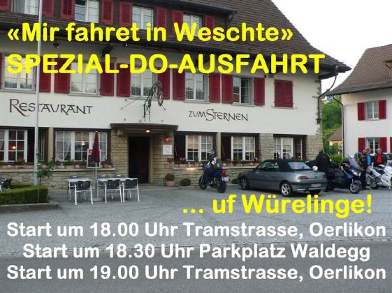 Den ersten Start an der Tramstrasse 109 gibt es um 18.00 Uhr mit Arthur und Alain. Die Ankunft im Ziel-Restaurant wird gegen 20.00 Uhr sein. Somit dauert diese Ausfahrt knapp zwei Stunden Fahrzeit. Den zweiten Start an der Tramstrasse 109 gibt es um 19.00 Uhr mit Renato und mir. Unsere Fahrt dauert kaum eine Stunde, aber wir garantieren für ein paar schöne Kurven auf dem Weg in den Pfannenstiel! |
