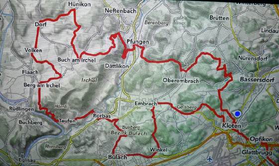 Das obige Bild zeigt die Tour, die Renato mit Urs gefahren ist. Wir fuhren über Wallisellen- Kloten- Gerlisberg- Bassersdorf- Oberwil nach Oberembrach, von dort nach Pfungen, durch die Weinberge zum Irchel hoch. Dann ging es weiter über buch- und Berg am Irchel nach Rorbas, dann Embrach, Augwil zurück nach Kloten, wo wir drei Minuten nach halb 9 Uhr eintrafen. Es war echt hart, meine beiden L-Fahrer kauften sich eine grosse Flüssig-Schokolade um wärmten sich am Riesenbecher wieder die Hände auf, bevor wir verabschiedeten: Ächt härti Sieche, nid? |