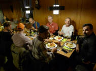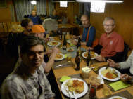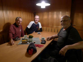 Aus organisatorischen Gründen schlägt die Wirtin ein Einheitsmenü vor: Piccatta mit Tomatenspaghetti, ein kleiner Salat im voraus (wahlweise 1 oder zwei Plätzli: Ich nur EINS!) Beim Start beim Tourguide bestellen, er übermittelt es mir und ich werde es um 7 Uhr vor dem Start anmelden. Die Serviertochter kann nicht den ganzen Abend bleiben, Küche und Service zusammen ist zuviel für die Wirtin!
