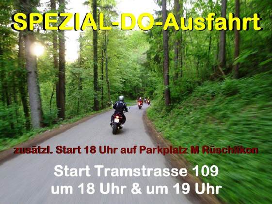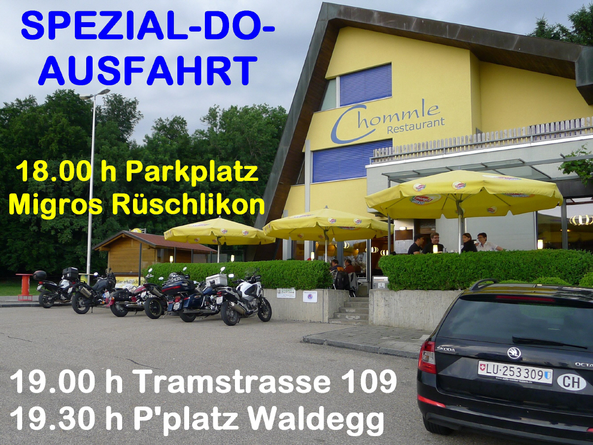 Den ersten Start an der Tramstrasse 109 gibt es um 18.00 Uhr: Arthur und Alain erwarten Dich. Diese Ausfahrt bis zum Ziel dauert gute zwei Stunden Fahrzeit. Den zweiten Start an der Tramstrasse 109 gibt es um 19.00 Uhr mit Renato und mir. Obwohl die Fahrt weniger als 1 ½ Std. dauert, wird es doch einige schöne Kurven auf dem Weg dorthin geben.