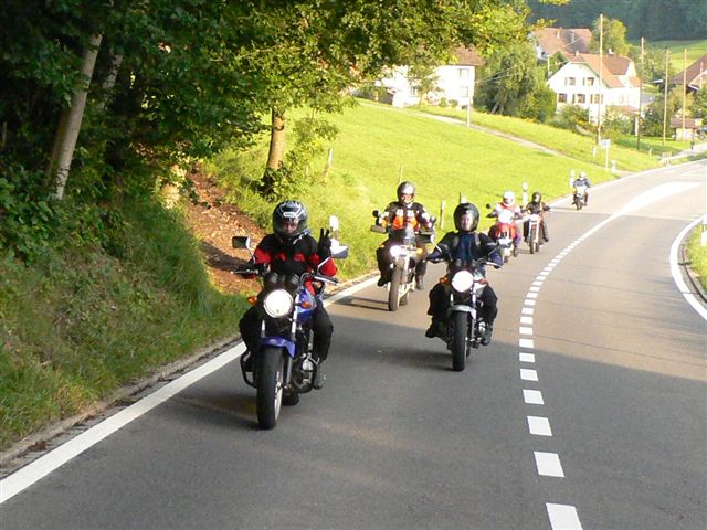 Wir starten jeweils um 19.00 Uhr an der Tramstrasse 109 (Lokalität des «home service») in Gruppen von 6 bis maximal 8 Motorrädern, die von einem Tourguide geleitet werden. Die Strecke ist nicht in jeder Gruppe die gleiche - im Unterschied zum Ziel: Da ist es (von Pannen abgesehen) IMMER das Gleiche! Die Rückfahrt geschieht auf eigene Faust, oft formieren sich auch Grüppchen, so dass niemand mitten in der Nacht verloren geht. Wir fahren rücksichtsvoll und halten alle Geschwindigkeitsbegrenzungen vorbildlich ein. (... fast immer!) Die Spielregeln werden jeweils erläutert. Wer mit leerem Tank kommt und die Gruppe zu einem Tankstopp zwingt, bezahlt in seiner Gruppe eine Runde! Dies gilt auch für die Tourguides.